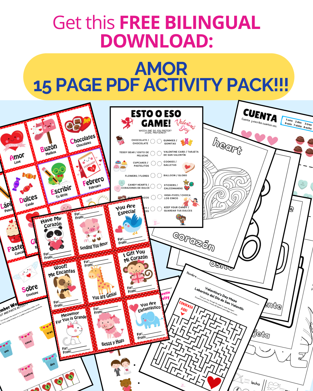 Celebrate love, culture, and Spanish learning with our Valentine’s Day February Free Printable! This 15-page bundle is perfect for kids ages 3–10 and includes: