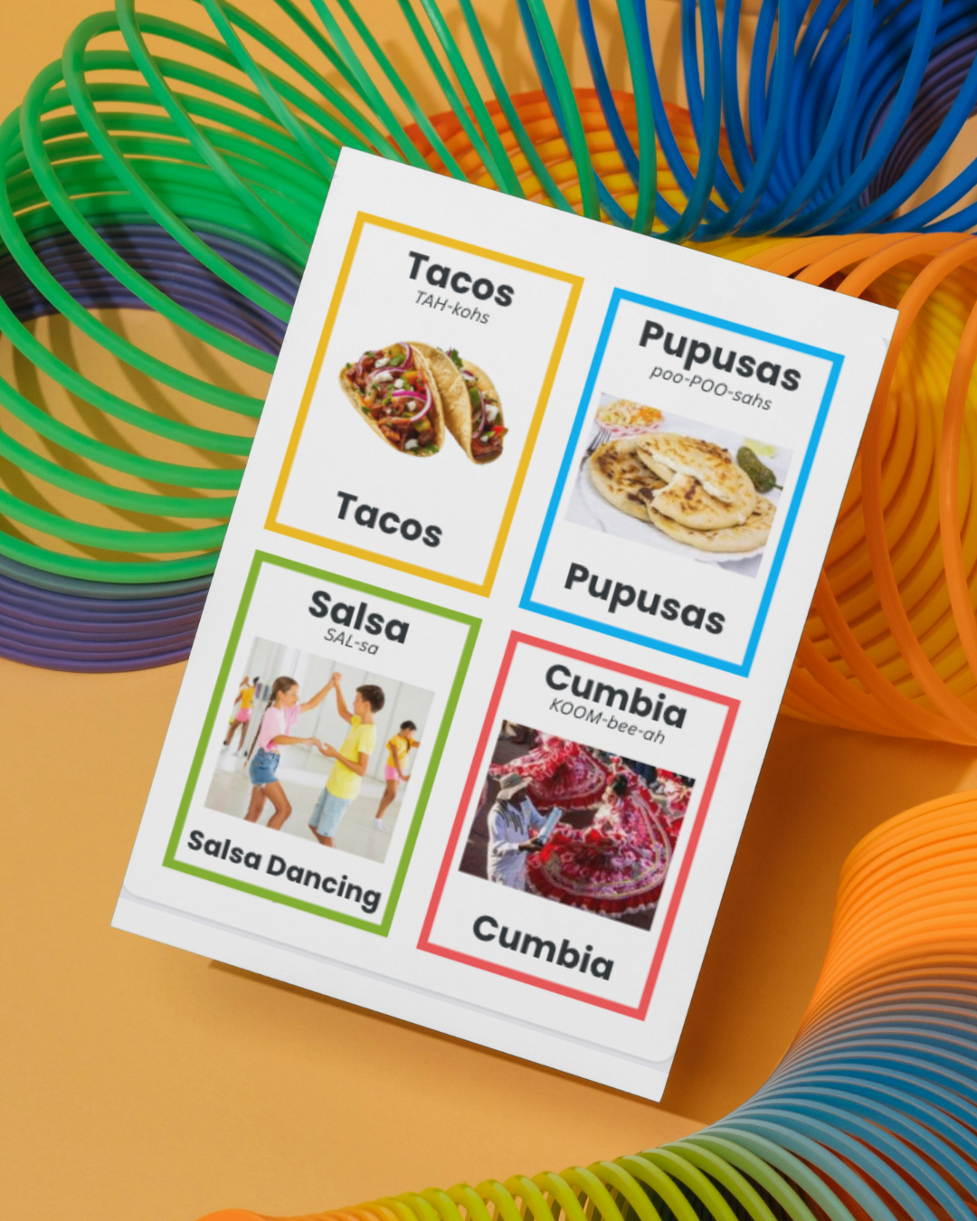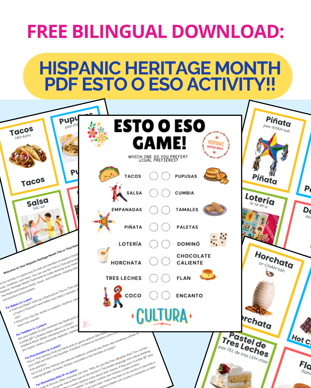 Celebrate culture and boost your child’s Spanish with our Hispanic Heritage “This or That” Game + Flashcards. Perfect for kids ages 3–10, this fun activity lets them choose between foods, music, and traditions (e.g., “Tacos 🌮 or Pupusas 🫓?” / “¿Tacos o Pupusas?”) while learning Español through play.